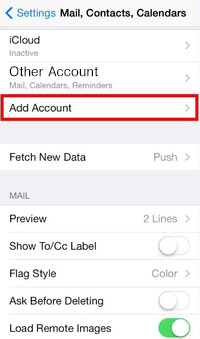 - Tap on the menu item of "Mail, Contacts, Calendars".